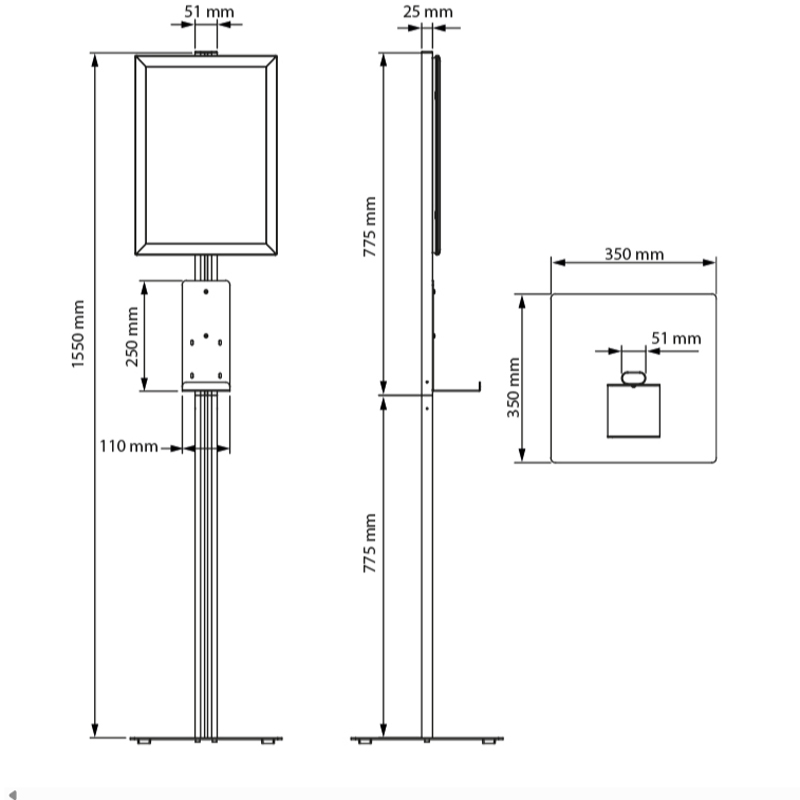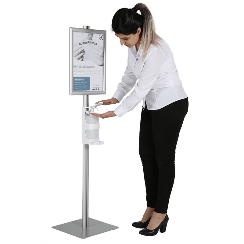 This easy to operate hand sanitiser stand incorporates an A3 portrait poster snap frame. It has a contemporary design with a sturdy rectangular metal base and part pole, both of which are powder coated in silver. The top snap frame is a silver anodised aluminium with a clear protective cover.