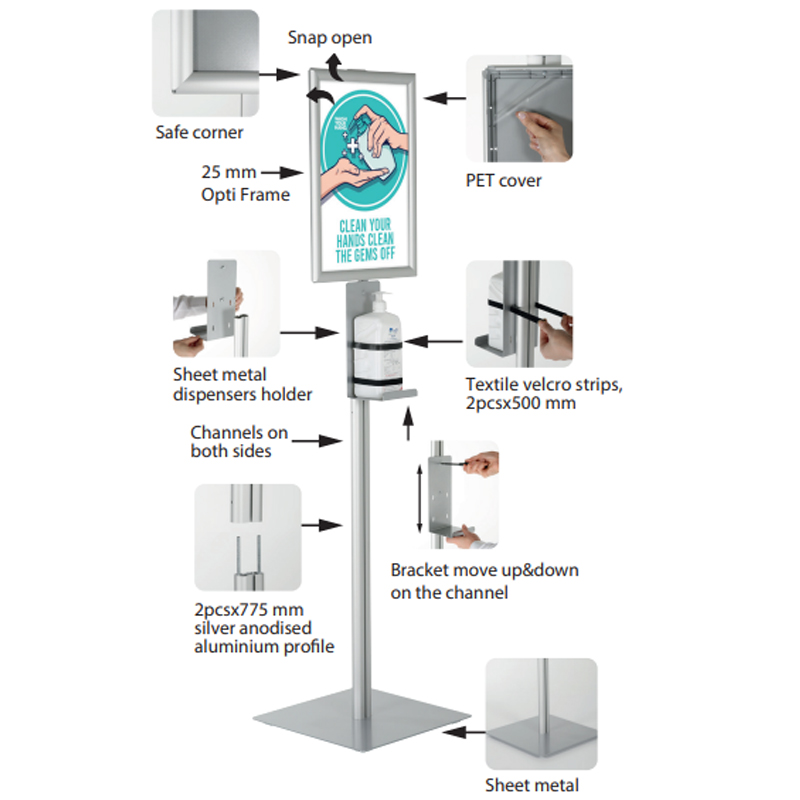 The free-standing anti-bacterial/virus gel dispenser is perfect for crowded venues and the A3 portrait snap frame enables you to clearly communicate the importance of regularly sanitising your hands. Please note the gel itself is not included.